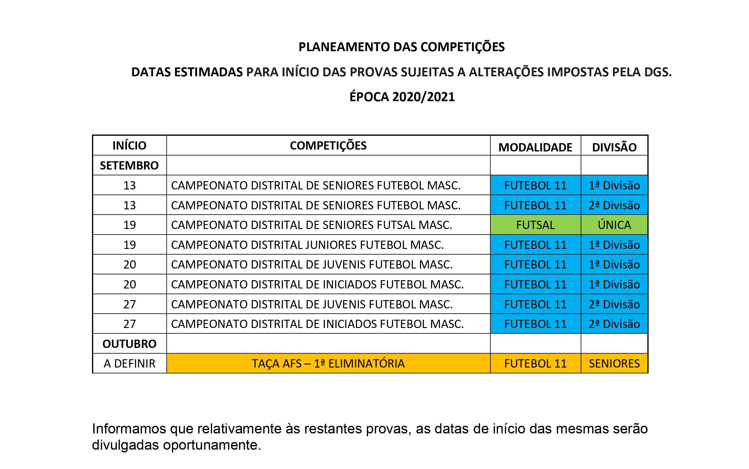 A Direção da AF Setúbal elaborou o planeamento para o arranque de algumas das competições a organizar na época 2020/2021, cujas datas apontadas poderão, contudo, sofrer alteração, em face de eventuais determinações da Direção Geral de Saúde.
