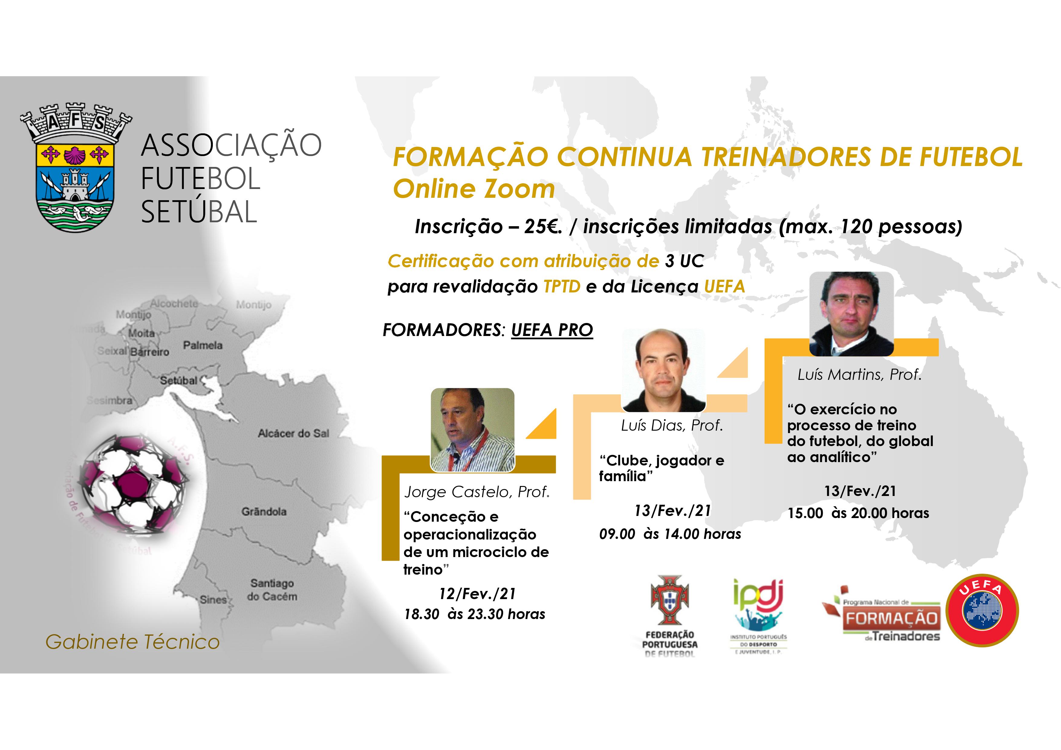 Recorde-se que a iniciativa da AF Setúbal, a realizar nos próximos dias 12 e 13 de fevereiro, à distância, conta com a participação dos professores Jorge Castelo, Luís Dias e Luís Martins na qualidade de formadores.