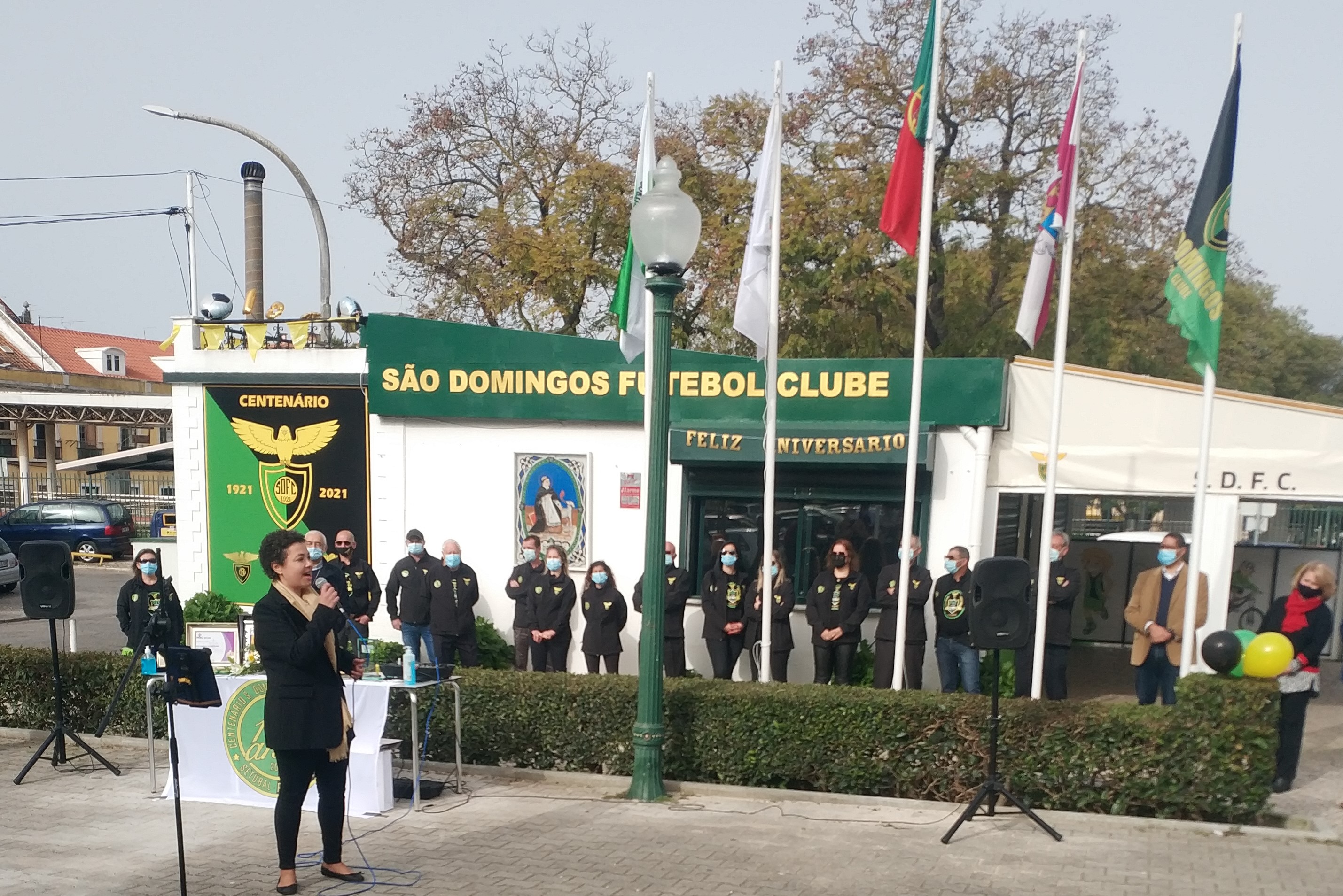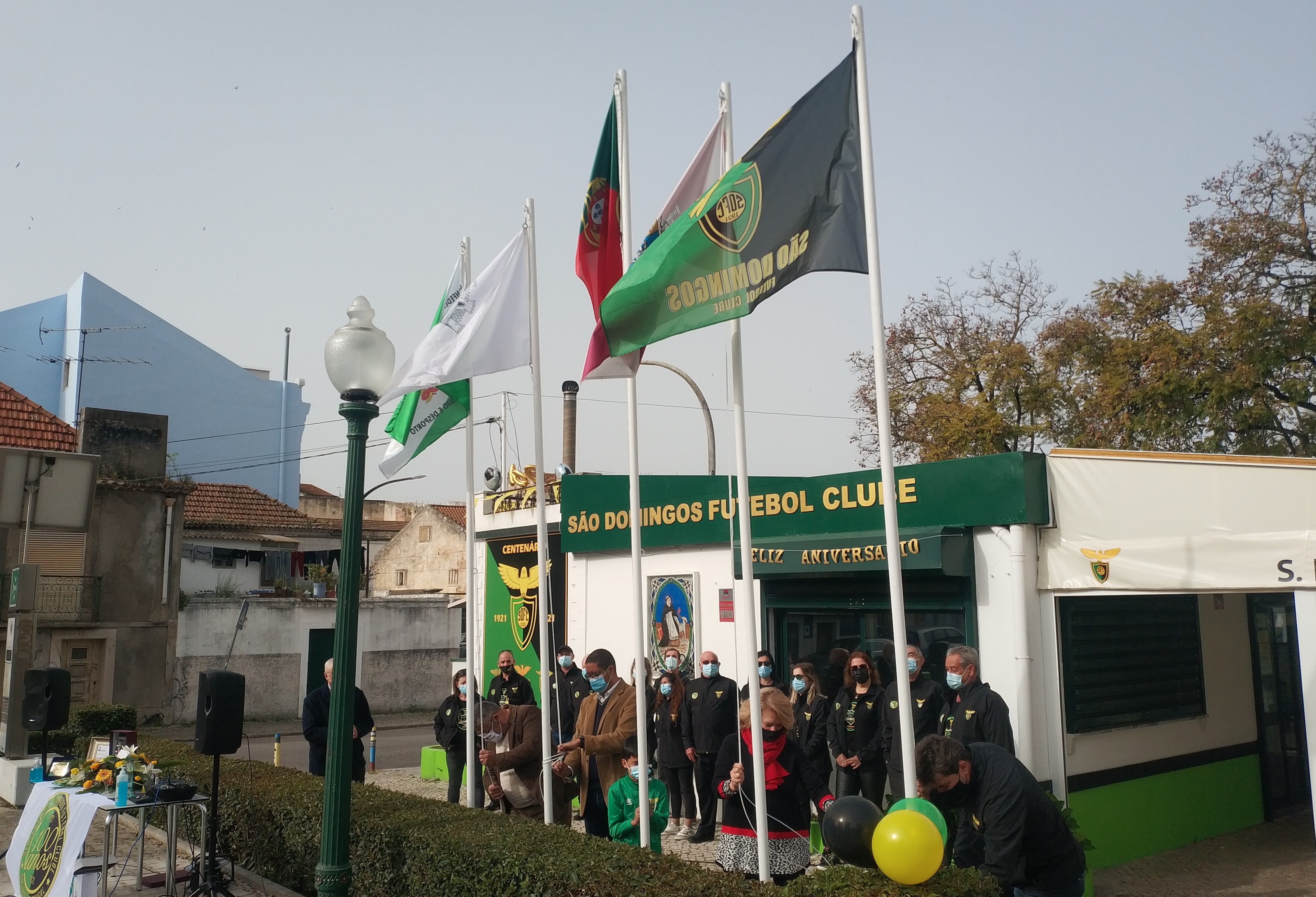 A manhã solene começou por gerar emoções no exterior da engalanada sede social do emblema sadino, com o hastear da bandeira e a apresentação do hino oficial do clube em dois momentos presenciados por um conjunto restrito de destacados convidados, que no cumprimento das devidas regras de segurança, partilharam, com entusiasmo, os primeiros sentimentos libertados no âmbito do evento comemorativo dos 100 anos de vida do São Domingos FC, que havia de ser complementado, minutos mais tarde, com uma distinção ‘prateada’.