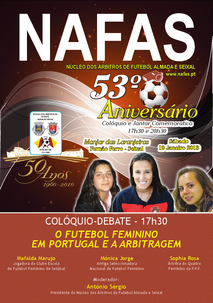 O Núcleo de Árbitros de Futebol de Almada e Seixal (NAFAS) celebra este sábado, em Fernão Ferro, Seixal, o seu 53.º aniversário. Um colóquio-debate e o tradicional jantar comemorativo são os dois pontos altos das comemorações.