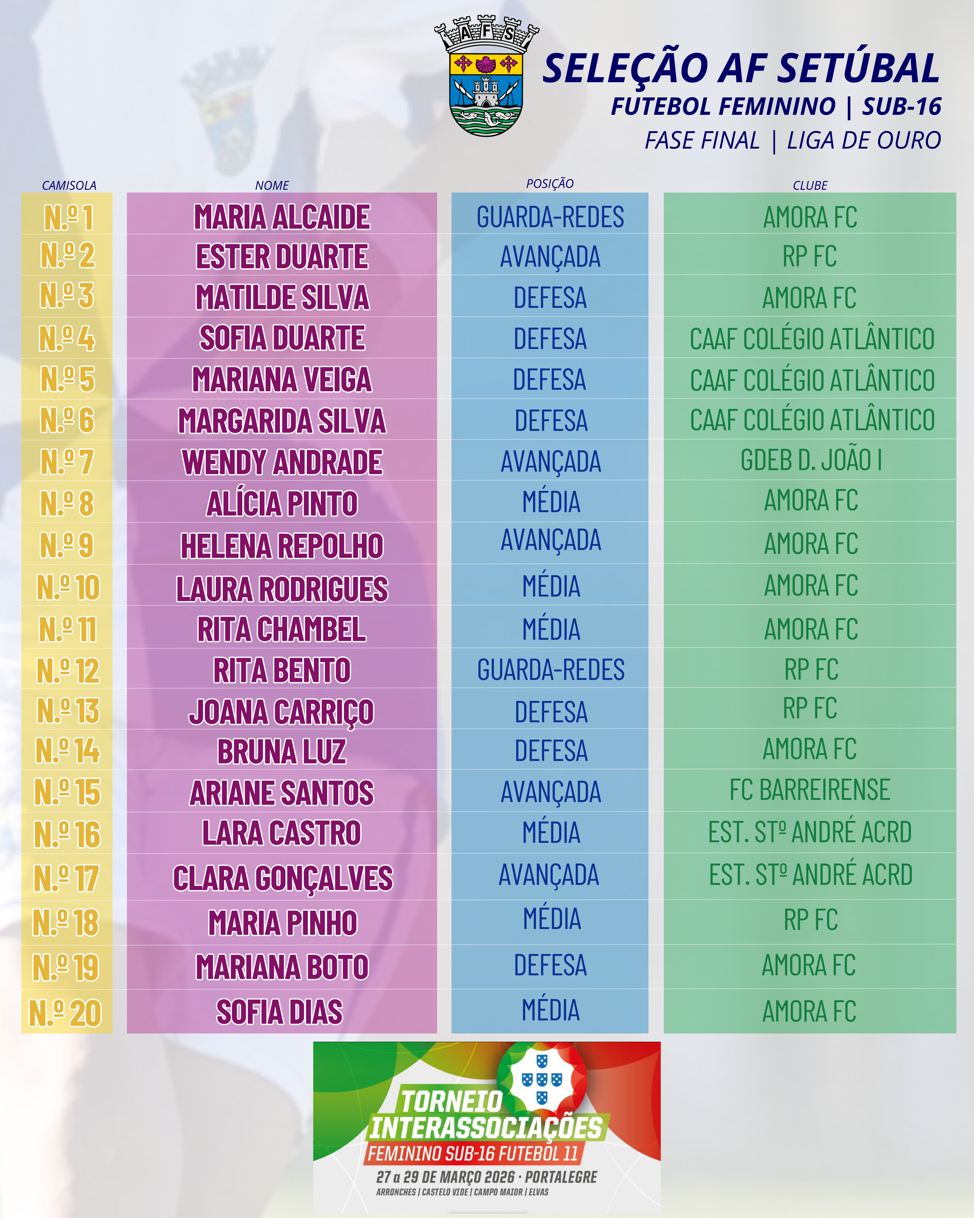 Com seis clubes representantes do nosso universo associativo, está definida a lista das 20 jovens futebolistas que vão vestir a camisola da AF Setúbal na Fase Final – Liga de Ouro da edição 2025/2026 do Torneio Nacional Interassociações Sub-16, em futebol feminino, a decorrer entre os próximos dias 27 e 29, na região de Portalegre.
